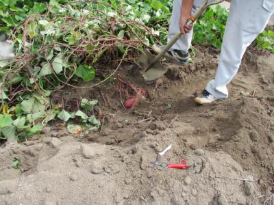 地上部(つる)の重さを計りました。 イモを傷めないようスコップで掘り起こします。