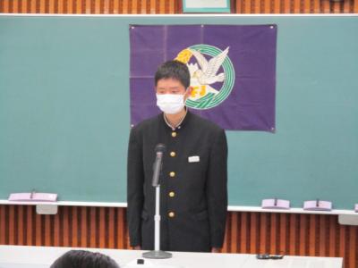 感染予防のため、窓を少し開けて行いました。 意見発表は8名の生徒が発表。
