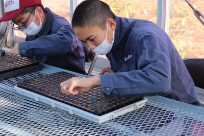 種を一粒一粒ピンセットで取ってセルトレーに植えていきます